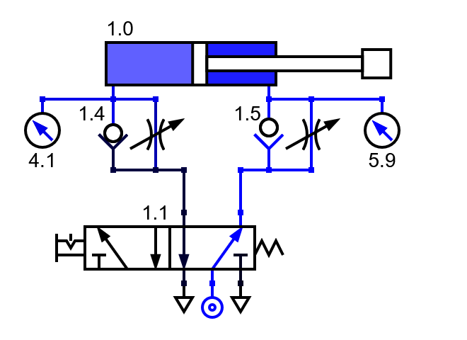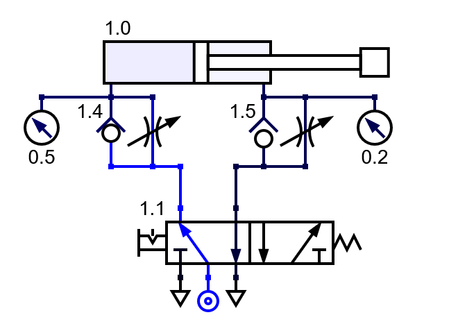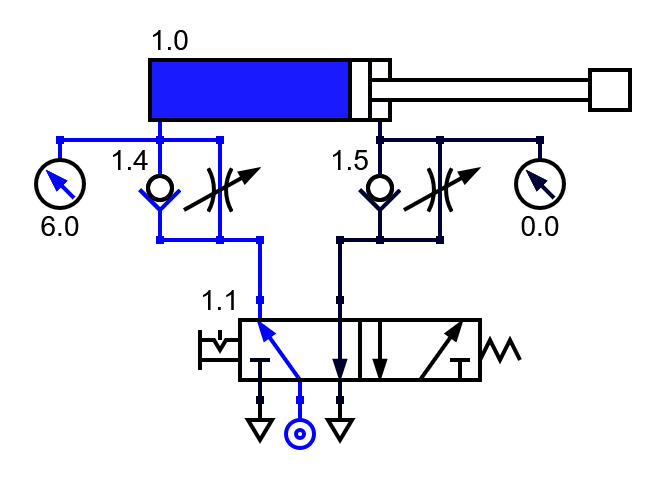 Simulate in the following simulator the slow movements of the double-acting cylinder with air outlet restricted by a regulating valve. Remember to press the 's' key to make the simulation progress step by step: