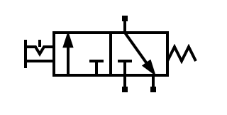 - Al llevar a reposo la válvula 3/2, el aire introducido en el cilindro tiene una vía de escape a través de la válvula, por lo que el cilindro retorna a su posición de reposo. Esto es equivalente a abrir otra válvula 2/2 para permitir el escape de aire.